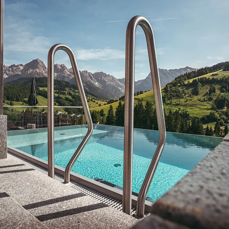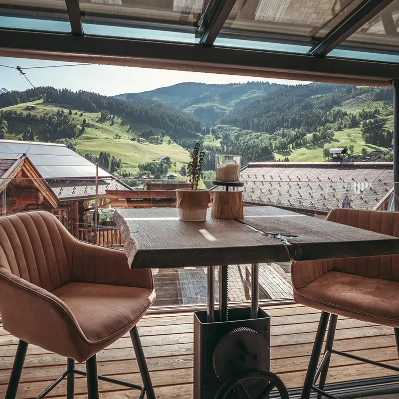 Wir hatten in unserer Hütte eine Panoramasauna mit extra großem Fenster und mit Blick auf die Berge. Hier kann man so richtig entspannen. Am frühen Morgen, in der Schaukel auf dem Balkon den Kuhglocken lauschen- herrlich!