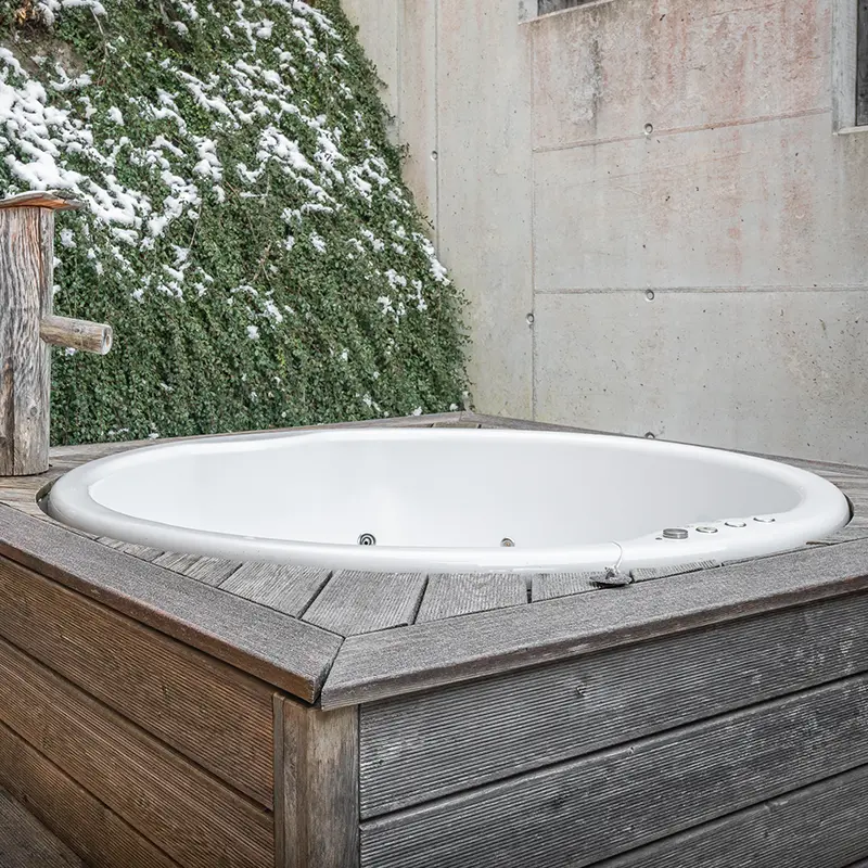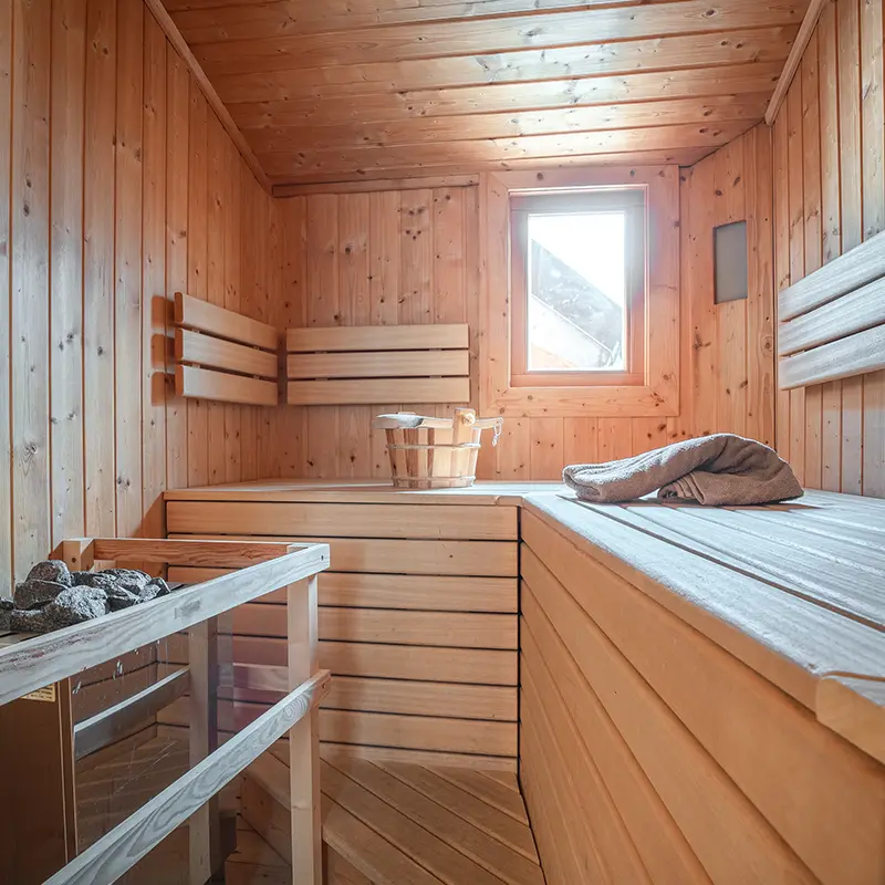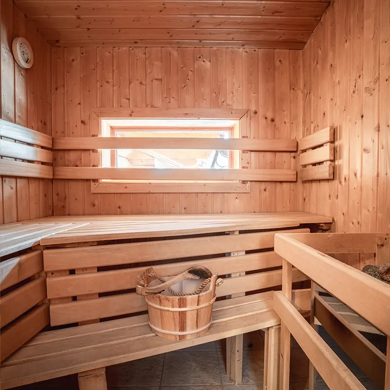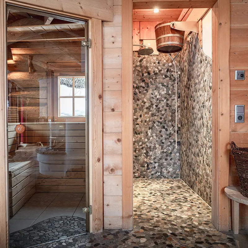 Wellnessbereich mit Indoor-Sauna, Outdoor- und Indoor-Dusche